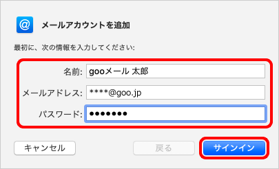4.以下の表を参照して各項目を入力し、[サインイン]をクリックします。